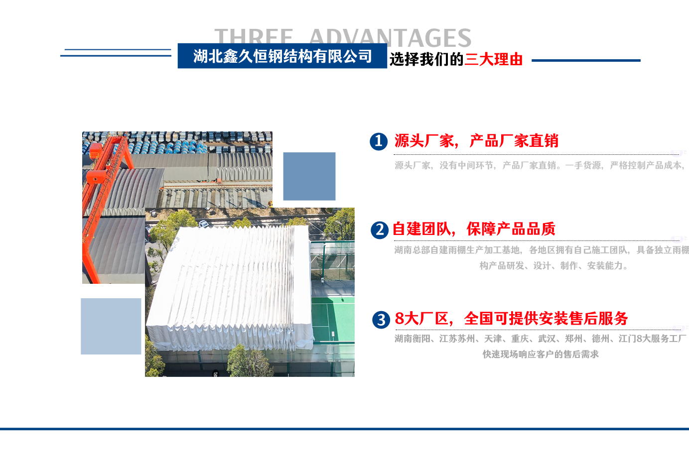 湖北鑫久恒鋼結(jié)構(gòu)有限公司是一家電動雨棚、膜結(jié)構(gòu)車棚研發(fā),生產(chǎn)銷售,施工安裝于一體的專業(yè)鋼結(jié)構(gòu)科技公司,主要產(chǎn)品有伸縮雨棚,電動雨棚,膜結(jié)構(gòu)車棚等。  湖南地區(qū)職員目前有80多人,占地面積20000平方米,廠房面積15600平方米,配備先進的生產(chǎn)流水線,使每件品質(zhì)產(chǎn)品的堅實基礎(chǔ)。  公司在蘇州、天津、重慶、武漢、德州、烏魯木齊、江門均設(shè)有服務(wù)工廠,總?cè)藛T共300多人,擁有專業(yè)的技術(shù)團隊,配備先進的設(shè)備和流水線生產(chǎn),產(chǎn)能高,貨源充足,發(fā)貨速度快,服務(wù)區(qū)域廣。  移動伸縮棚適用于通道臨時倉儲、戶外運動遮陽、污水池遮蓋、能源交通、熱力化工、礦山、船舶制造及市政建設(shè)、物流、碼頭等領(lǐng)域的構(gòu)件制作加工,成品半成品存放、倉庫、野外儀器設(shè)備操作用房等。尤其是對工廠發(fā)貨、倉儲臨時遮雨防嗮,梅雨期較長、建設(shè)周期較短的工程施工等特別適用。還可根據(jù)用戶需求量身定制、適合企業(yè)所需不同款式的產(chǎn)品。  我公司堅持“誠信社會為本,客戶滿意為榮”的經(jīng)營理念,做到質(zhì)量把控,嚴格管理,精益求精,恪守承諾。使鑫久恒逐步走向成熟,其系統(tǒng)化、專業(yè)化日趨完善。以專業(yè)的技術(shù)、科學的管理,更高的產(chǎn)品質(zhì)量,優(yōu)良的企業(yè)信譽,真誠的客戶服務(wù),靈活多樣的經(jīng)營方式和務(wù)實創(chuàng)新的企業(yè)精神愿與社會各界攜手合作,為推動智能鋼結(jié)構(gòu)建筑事業(yè)的發(fā)展而不斷努力。...